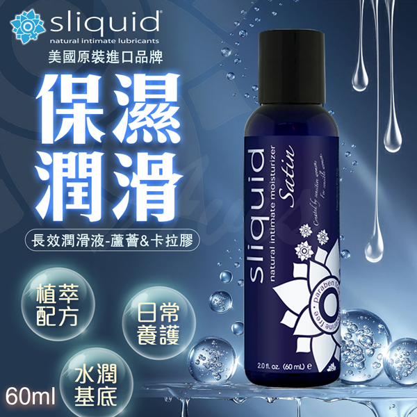 Sliquid Naturals Satin 為水性潤滑液,添加蘆薈、角叉菜膠與維生素 E 植物萃取,質地自然滑順,適合日常使用。